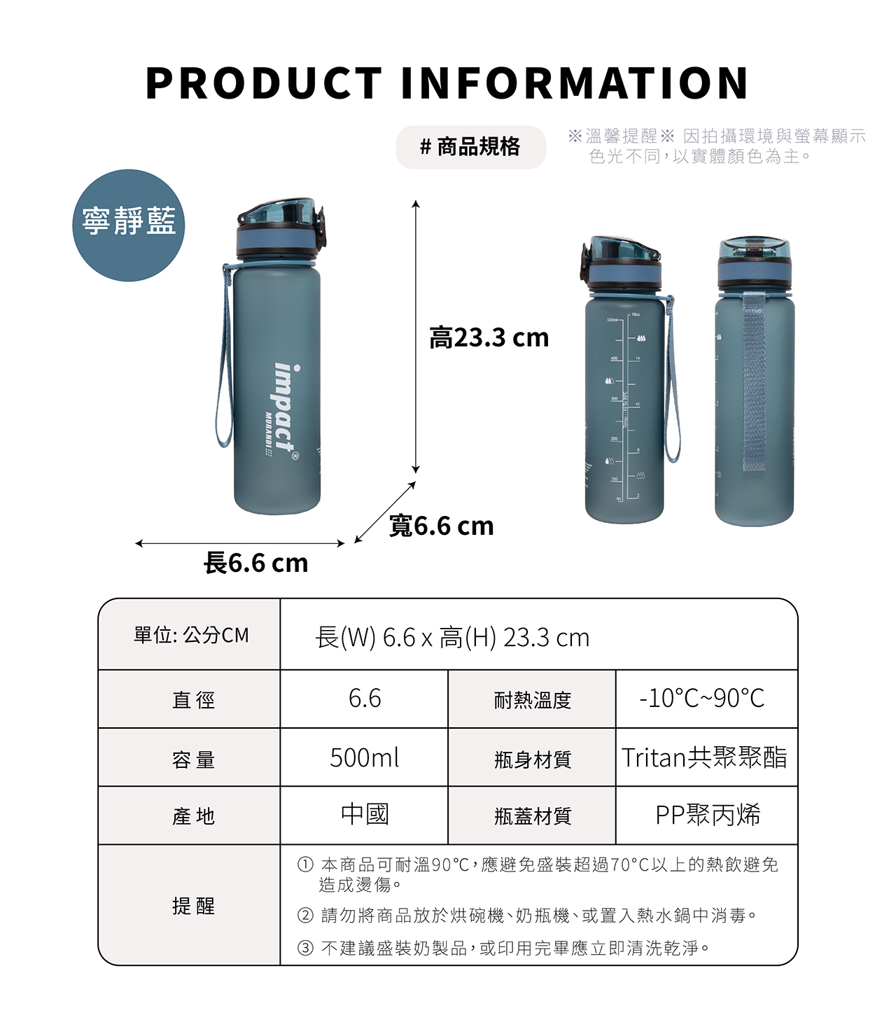 -瓶身耐熱溫度: -10 ~ 90度C,瓶蓋耐熱溫度: -10 ~ 90度C